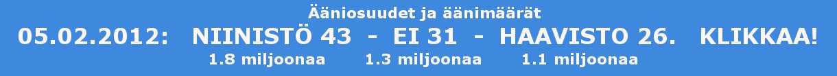 TIISTAI.fi - 2012/03/14 - Kuva. "Venus ja Jupiter tiistaina 2012-03-13 19:06." - "Iso tikari sydämeen eli Hilkka Ahde tyrmistyi suhdeväitteistä" - Tästä kaikki alkoi ... Kuva - HS (Mikael Pentikäinen) pyytää anteeksi Ahteelta. Lue! - Anteeksipyyntö muuttui kommentiksi. Lue! - Risto Uimonen: ”Pillupoliisina toimiminen on osa yhteiskunnallisesti merkittävää keskustelua.” Lue! - Uimonen: AKT:n suhdehuhut osa merkittävää keskustelua. Lue! - Kommentti. Lue! - Kuva. "Power, power". Nuorisojoukko intoutuu ,,, - Kuvia. Instanssi 2012. Digitaalisen tekemisen festivaali. - Kuva. Ylämäessä. Tapaus: AKT. Hilkka Ahde, Timo Räty ja Naisten päivän hiljainen minuutti - Kuva. Rahaa! - Pikavippien kieltoaloite eduskunnassa, - Kuva. 4 koiraa lumisella kadulla taitavan taluttajan ohjauksessa. - Kuva: Harrastakaa! - "Hakkarainen, kalsarit ja Ilta-Sanomat" - Kuvia. Jyväskylä 7's Snow Rugby Tournament 2012. Kuva. "Baanalle on päästävä maaliskuun alun aurinkoisena päivänä." - Kuva. "GRAND CENTRAL TERMINAL HELSINKI torstaina 2012-03-01 12:15." - Eduskunnan puhemies Eero Heinäluoma puhuu vieressään väistyvä presidentti Tarja Halonen vieressään alkava presidentti Sauli Niinistö. Kuvan kello käy Suomen aikaa Café Laukaassa Keski-Suomessa ja viiden minuutin päästä lähtee bussi, johon kuvaajan Pertti Mannisen on kiirehdittävä. Kellossa: GRAND CENTRAL TERMINAL NEW YORK. - TOP 20 - Tammikuu 2011 - Nettisanomat/ Sanomanetti-sivustot. Eri kävijät. - Presidentivaalit 2012 - Kuvia - Tulos: Ääniosuudet ja äänimäärät pyöristettyinä: Niinistö 43 8 (1. 8 miljoonaa), EI 31 (1.3 miljoonaa), Haavisto 26 (1.1 miljoonaa) - Kuvat. "01.01.2012". -- Lukijan kuva: "Katso tuolla on Hakkarainen!" - Kuva. Käden ojennus. Karuselli. -tiistai 28.02.2012 - etusivu - Nettisanomat - Sanomanetti - Blogi: Viikkosanomat.fi - Kuvasanomat - Sanomatori - Viikkosanomat - Härkää sarvista - "Venus ja Jupiter tiistaina 2012-03-13 19:06." - Keski-Suomi. Jyväskylän seutu. Laukaa. Keskusta. Kantolantie. Kuva tiistaina 2012-03-13 19:06. Pertti Manninen. |